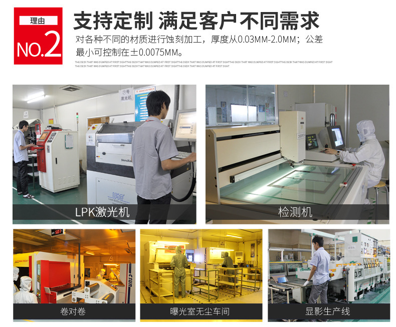 公司擁有美國CHEMCUT、德國奧寶、法國AUTOMA全自動卷對卷曝光機(jī)等國際知名品牌的先進(jìn)生產(chǎn)設(shè)備,設(shè)備和工藝處于國內(nèi)領(lǐng)先水平,日產(chǎn)能達(dá)1000余平方米。產(chǎn)品原材料以進(jìn)口為主,能夠?qū)Ω鞣N不同的金屬材質(zhì)進(jìn)行蝕刻加工,厚度從0.01 mm 到2 mm,最小公差可控制在±0.0075 mm。根據(jù)客戶圖紙結(jié)合公司專業(yè)的蝕刻工藝整合技術(shù),制造各種精密金屬蝕刻元件,通過使用數(shù)字化的模塊,客戶可隨時改進(jìn)或改變設(shè)計,避免高額模具費(fèi)用,為客戶減少生產(chǎn)成本,同時,先進(jìn)的設(shè)備和工藝可保證24小時內(nèi)完成樣品。