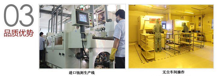 3.我司以強(qiáng)大的技術(shù)力量(高級(jí)研發(fā)工程師8人,工程師16人,技術(shù)員20人)和先進(jìn)的生產(chǎn)設(shè)備(美國(guó)進(jìn)口蝕刻機(jī))來保證準(zhǔn)時(shí)的交貨期限。