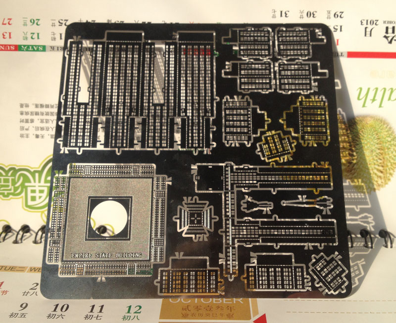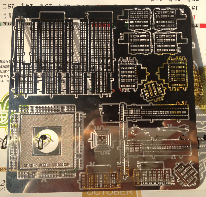 現(xiàn)有的蝕刻片材質(zhì)有兩種,一為不銹鋼,一為銅。不銹鋼產(chǎn)品的外觀亮麗,且能制出很細(xì)致的細(xì)部線條,比較適合超細(xì)部的表現(xiàn),但因其硬度高,所以在切割及加工時(shí)較麻煩,而且無(wú)法用一般的烙鐵來(lái)焊接組合。銅的外觀不及不銹鋼的亮麗,但硬度低,很容易加工,可以用一般的烙鐵來(lái)焊接組合。蝕刻片不光是用在細(xì)部零件用途上而已,現(xiàn)已有更多的輔助工具是利用它的特性所制成。